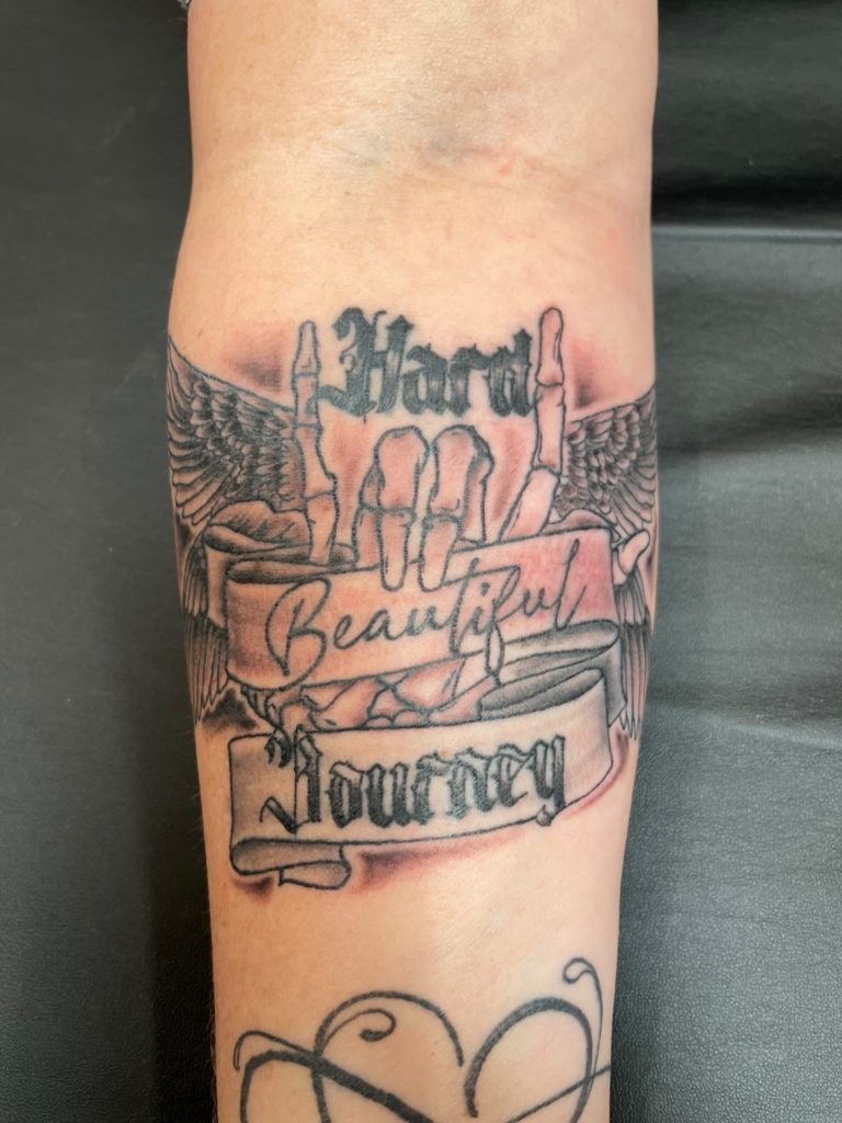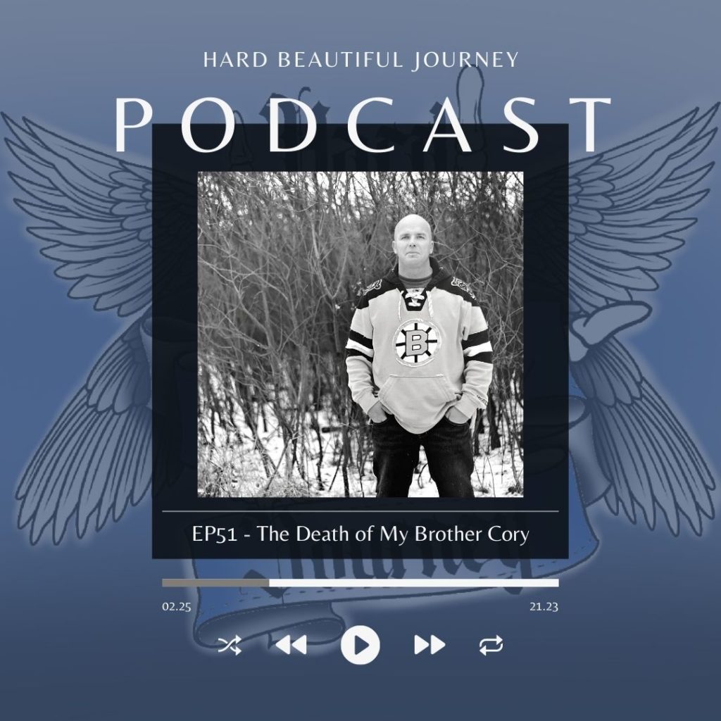 Now back to the logo idea Cory showed me in my meditation. I immediately knew the person I wanted to bring it to life. My tattoo artist Eric. So I reached out to him….with a very long Instagram message! I met with him and said I’d like a rocker hand with double angel wings and the words Hard Beautiful Journey. I also wanted the colour’s black, white and blue (Cory’s favourite colors). What Eric came up with still takes my breath away….and is now the cover of this podcast and will be used for the foundation when we get it started. And….of course, I got it tattooed on my arm. And if you know my zero pain tolerance….then you know how much I love Cory! I will always be reminded of my beautiful brother every time I see it. Eric, thank you again from the bottom of my heart for using your amazing talent to bring this to life – I know Cory loves it as much as I do.